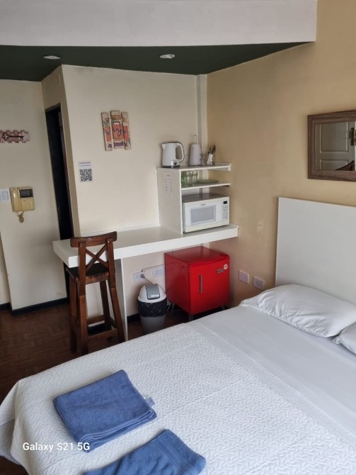 Este monoambiente luminoso al contrafrente es ideal para una estadía cómoda y relajada. Equipado para 2 personas, cuenta con somier de 140x1,90, frigobar, horno microondas, baño completo, televisión por cable, wifi, aire split frío/calor y cortinas blackout. Todo incluido: cable, wifi, Edesur, expensas.